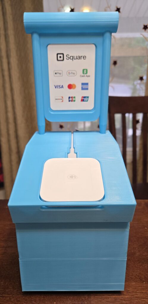 This is the prototype of the ‘Square’ Reader stand designed by me in October 2025. It’s not perfect but functional. I added clear rubber feet from Menards that stick on the printed feet to stop the stand from sliding when a credit card is inserted into the Square slot. I have included the CAD design and the Cura files.